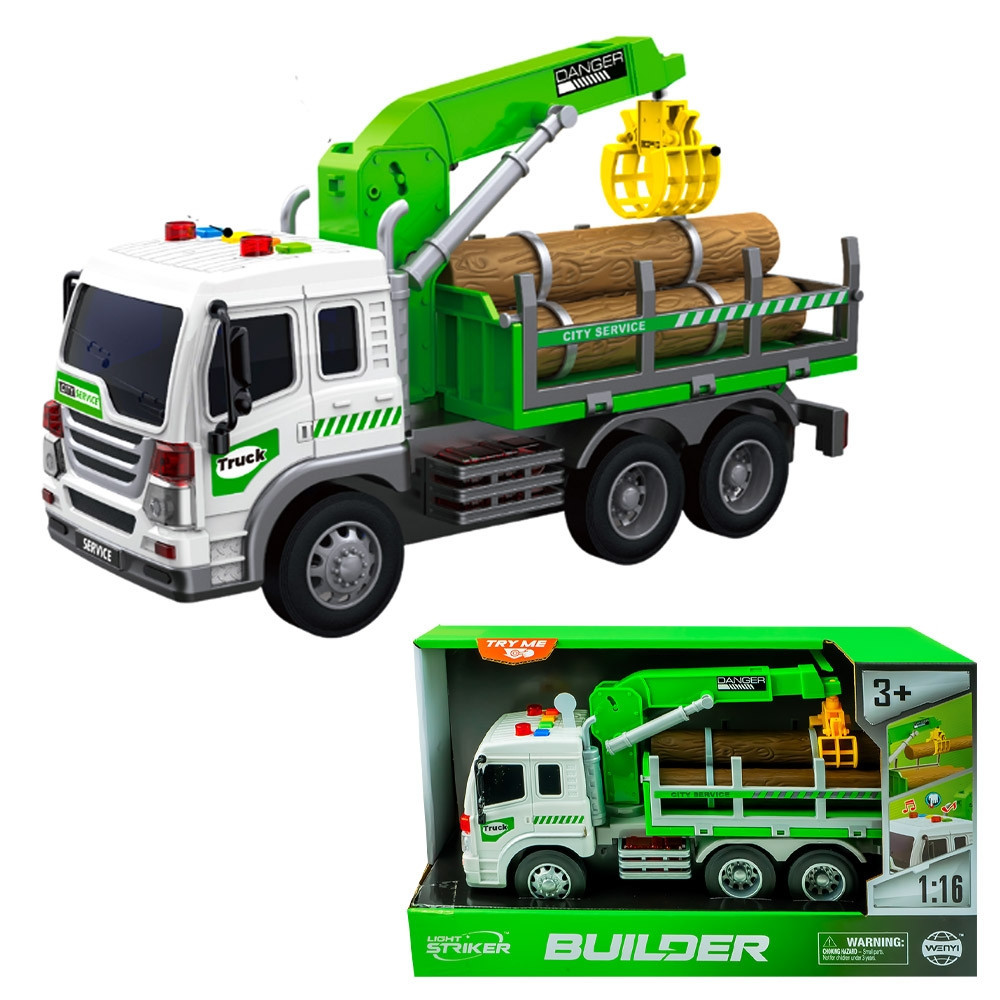 – Camionul este echipat cu remorca basculanta, ce are partile laterale si partea din spate rabatabile. Pe platforma vehicului este plasat un brat articulat, mobil pe verticala. Bratul este prevazut cu graifer pentru ridicare/coborare busteni. Cei mici vor fi incantati de functiile de sunet si lumina declansate de cele patru butoane de pe plafonul cabinei. Luminile intermitente ale celor doua girofaruri vor atrage atentia asupra incarcaturii speciale, iar sunetele specifice de pornire masina, functionare motor, claxon si avertizare sonora vor aduce note de realism jocului. Deplasarea vehicului se realizeaza prin frictiune. Aderenta la sol a rotilor este mare, acestea avand suprafata din cauciuc. Camionul este realizat la scara 1:16.
