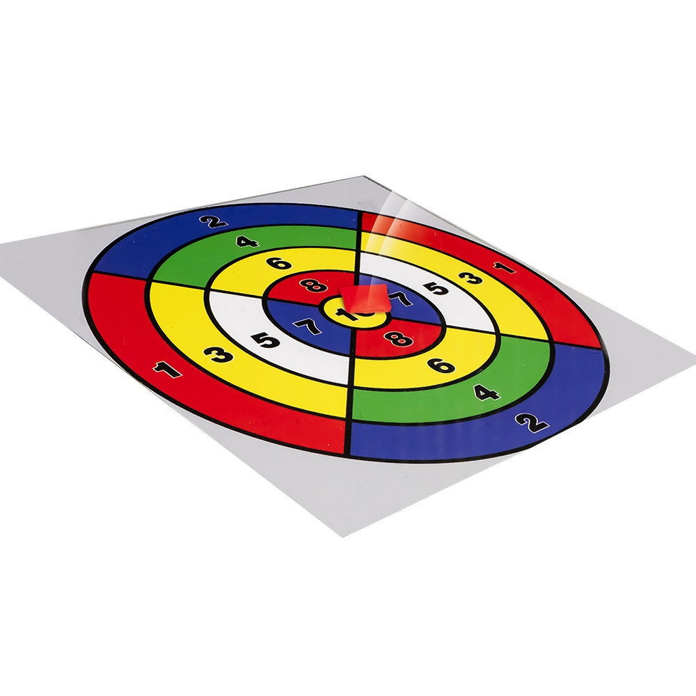 – Covorasul este realizat din nailon cu imprimeu multicolor. Desfasurati covorul-tinta pentru a dezvalui cele saptesprezece zone colorate, formate din cinci cercuri concentrice, din care patru sunt impartite de doua linii diagonale. Zonele sunt numerotate pentru a creste nivelul de provocare. Asezati tinta pe o suprafata plana si fixati-i colturile cu cei patru tarusi, iar apoi porniti jocul.