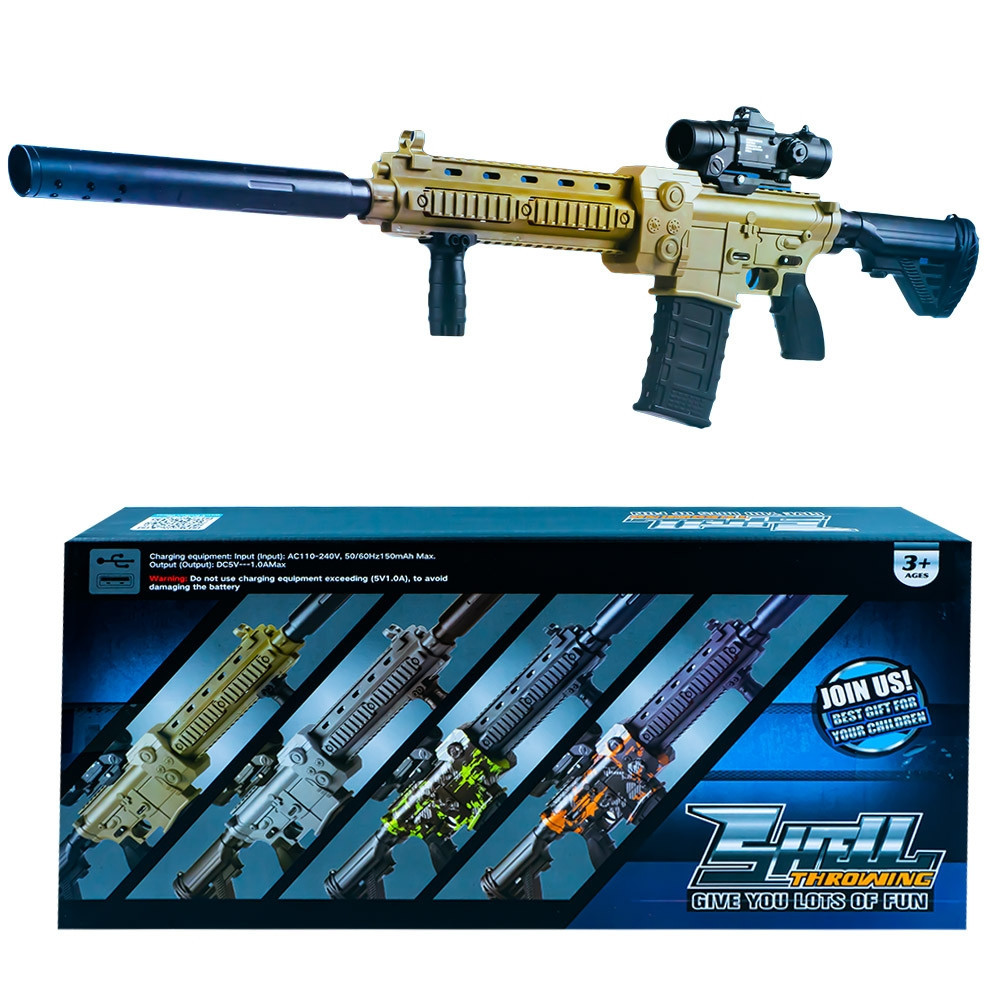 – Setul contine 1 mitraliera care se asambleaza din 7 piese, 1 curea, 1 cablu USB, 1 acumulator si 20 gloante burete.